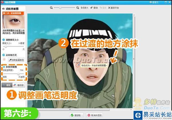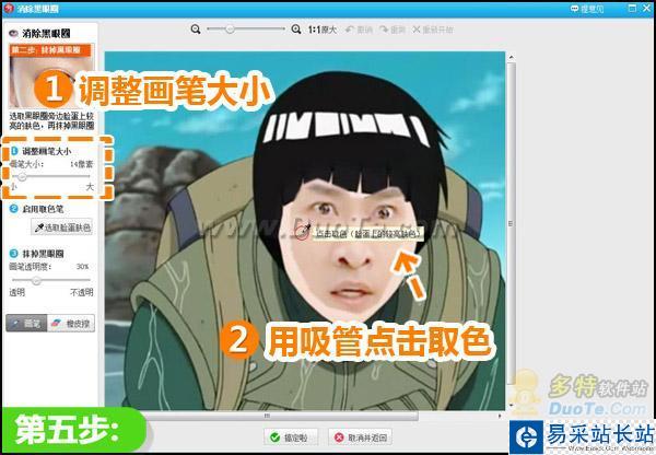 5、為了讓換臉效果更理想,選擇“消除黑眼圈”工具,調(diào)節(jié)好畫筆大小后,先用吸管工具在爾康臉上點擊取色。