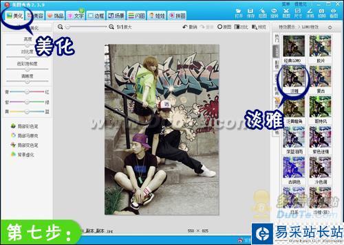 7.最后選擇“美化”菜單,在右側(cè)為照片添加一個喜歡的特效,不僅可以讓照片的色澤更好看也能讓涂鴉效果更貼合、逼真,我選擇的是LOMO——淡雅特效。