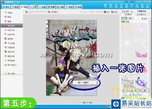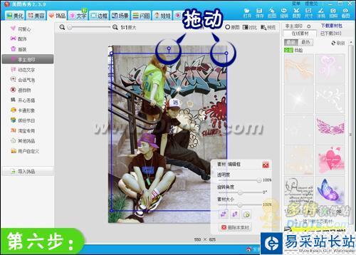 4.現(xiàn)在選擇“飾品”界面里的“非主流印”功能,在右側(cè)挑選喜歡的涂鴉飾品,并用編輯框調(diào)節(jié)適當?shù)娘椘吠该鞫取⒋笮『臀恢眉纯?/p>