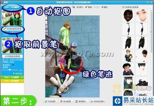 2.進入摳圖編輯界面后,選方法1:自動摳圖,然后單擊“摳取前景筆”并用綠色筆跡涂抹需要保留的部分