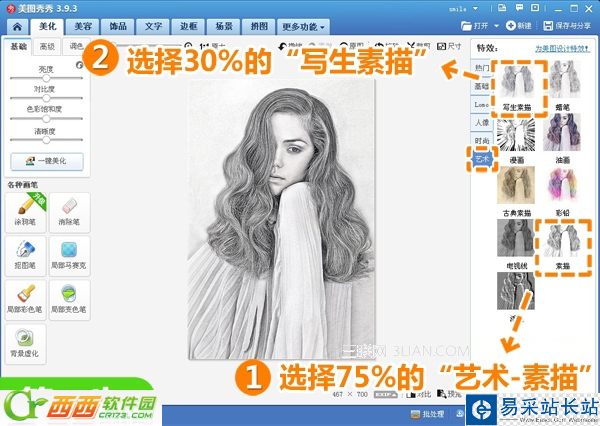 2、選擇75%的“藝術(shù)-素描”特效,再選擇30%的“素描”特效,變?yōu)樗孛璁?huà)像。