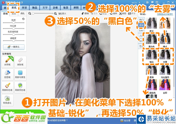 在軟件下打開(kāi)待處理的照片,在“美化”菜單下選擇100%的“基礎(chǔ)-銳化”特效,再選擇50%的“銳化”特效,選擇100%的“去霧”特效,最后選擇50%的“黑白色”特效。