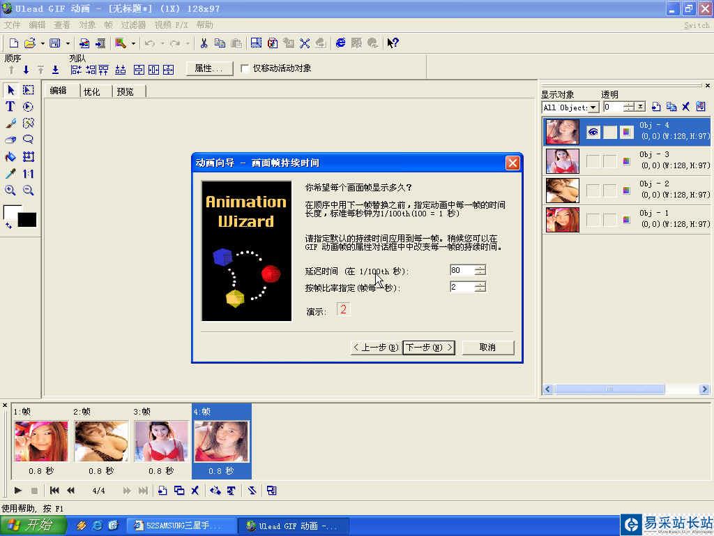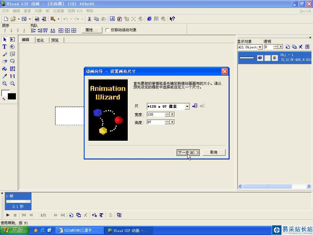 3.輸入寬度和高度。也就是說你要做的GIF動畫是128×97就在寬度欄輸入128,在高度欄輸入97(想改成別的也可以,前提是你修改完的圖片也要和這個一樣的尺寸)點擊“下一步”
