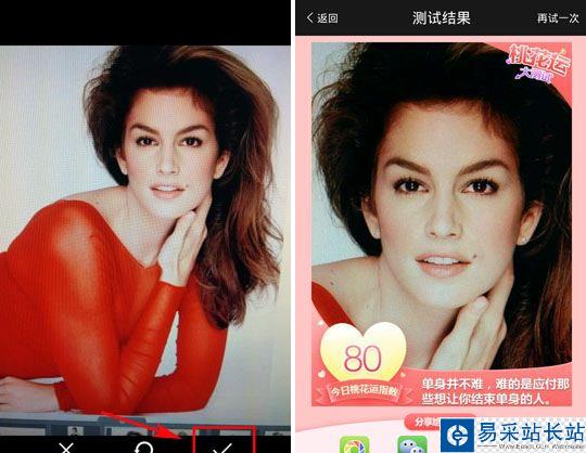 3、進入拍攝界面,拍攝好一張照片后,點擊“√”按鍵,這樣美圖秀秀就會自動測試出你的桃花運啦!