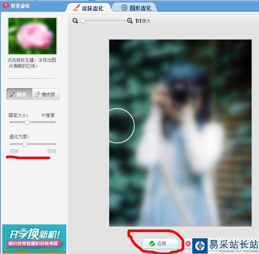第一步,美圖秀秀打開一張圖片。如圖所示:紅圈圈里的就是你們要做的操作,美化→背景虛化