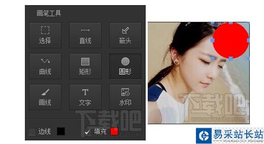 3.右側(cè)的畫(huà)筆工具點(diǎn)擊圓形,按下圖所示設(shè)置。然后按住Shift鍵在頭像上拖出一個(gè)圓圈,并移動(dòng)到右上角對(duì)齊邊界。提示:用上下左右方向鍵移動(dòng)圖像更精準(zhǔn)。