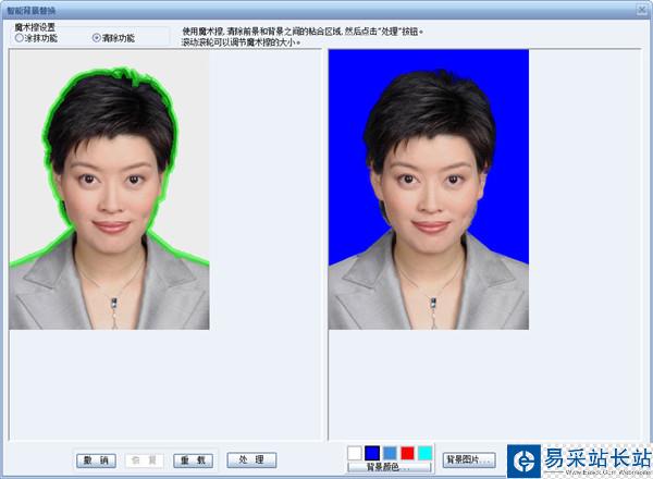 4.替換背景。點擊“背景處理”,利用對話框中的涂抹功能和清除功能,替換背景顏色或者背景圖片。