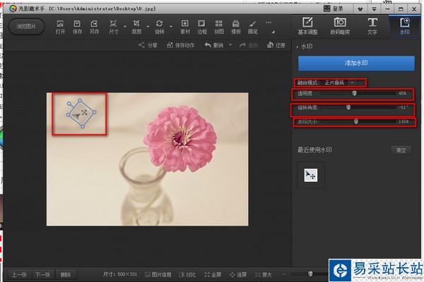 第四步:添加進(jìn)來后,在后邊的區(qū)域?qū)λ∵M(jìn)行調(diào)節(jié),(可以調(diào)節(jié)大小,圖片的樣式,旋轉(zhuǎn)的角度,已經(jīng)透明度)