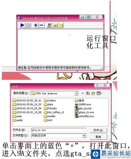 2、運(yùn)行窗口化工具,并點(diǎn)擊+符號(hào)選擇圣安地列斯的啟動(dòng)文件(gta_sa.exe 漢化的用 gtasa_cn.exe)