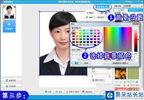 3.單擊“完成摳圖”后會自動進入摳圖換背景界面,單擊“背景設置”并選擇顏色背景,然后選擇顏色背景的顏色并輸入需要的背景大小。如圖4所示。