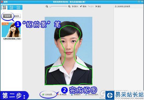 2.軟件會自動進入“自動摳圖”界面,選擇“摳前景”筆在需要的人物畫面上涂抹即可(如果發生錯誤可以用“刪背景”筆涂抹錯誤部分即可)。完成后單擊“完成摳圖”,如圖3所示。