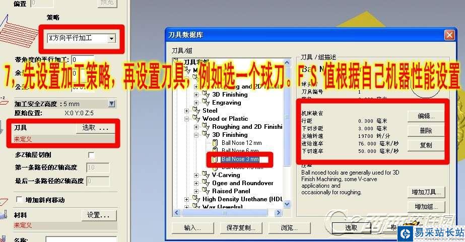 7、先設(shè)置加工策略,再設(shè)置刀具,例如選一個(gè)球刀。FS值根據(jù)自己機(jī)器性能設(shè)置。