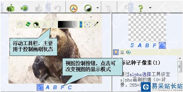 視圖控制按鈕,每個字母對應視圖的一種顯示模式(S=源圖,A=alpha圖,B=背景圖,F=前景圖,C=合成圖);