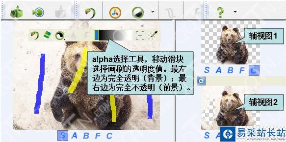 3.使用alpha畫刷添加種子像素標記,即告訴摳圖算法哪些區域是前景,哪些區域是背景。如下圖所示,黃色筆刷表示所覆蓋的像素為前景;藍色筆刷表示所覆蓋的像素為背景。