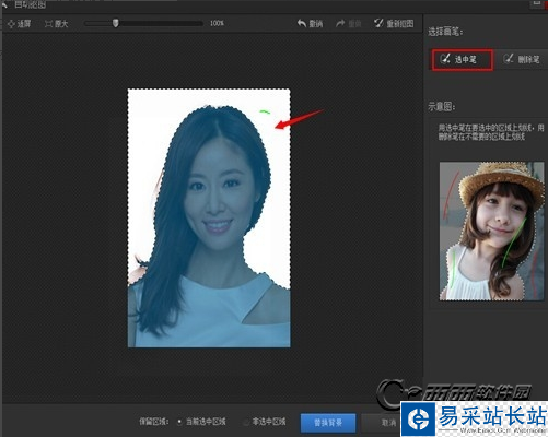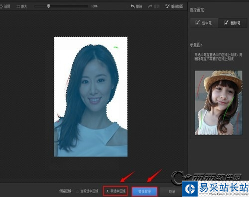5、根據(jù)涂抹的實(shí)際情況選擇保留區(qū)域,因?yàn)楣P者涂抹的是人像外區(qū)域,所以勾選“非選中區(qū)域”,然后點(diǎn)出“替換背景”。