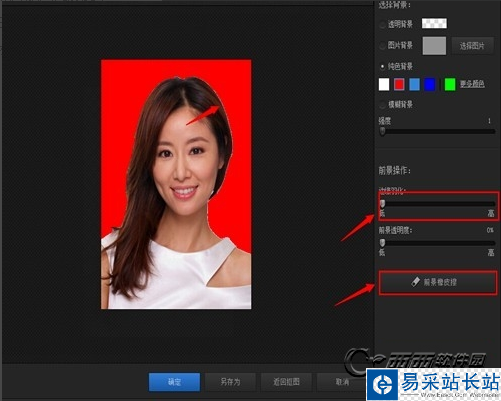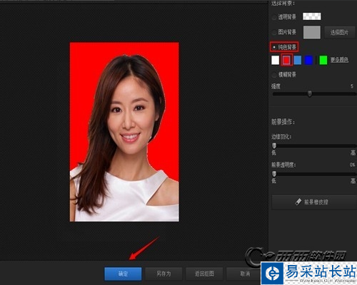 6、進(jìn)入“替換背景”對(duì)話框,在純色背景選擇顏色。筆者選擇紅色,然后確定。在此提醒一下,如果發(fā)現(xiàn)邊緣有比較明顯的白色線條,可通過(guò)“邊緣羽化”來(lái)模糊,或者直接選擇“前景橡皮擦”來(lái)恢復(fù)前景(大家可親自體驗(yàn)一下)。