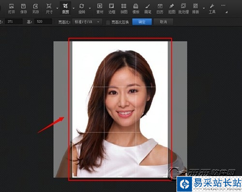 1、將你要制作成一寸照片的相片放入光影魔術(shù)手中,點(diǎn)擊“裁剪”功能,在寬高比下拉框中選擇“標(biāo)準(zhǔn)一寸/R”規(guī)格,然后裁切,再確定即可,如下圖。