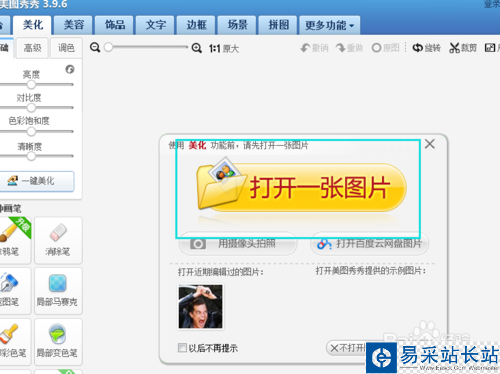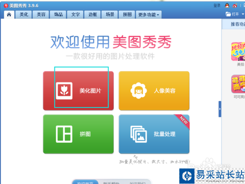 下載好美圖秀秀安裝好后,找到快捷方式,雙擊打開。點擊美化圖片。他還有人像美容和拼圖批量處理功能,其實美圖秀秀算是簡單版的PS。