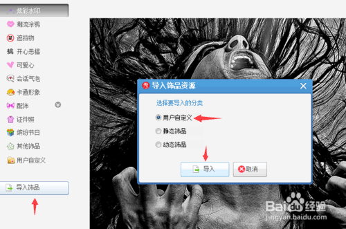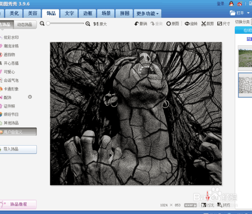 在上方工具欄中,找到飾品工具,點擊。然后在左側下方有一個導入飾品,點擊一下,選擇用戶自定義,導入一張類似石化效果的圖片。