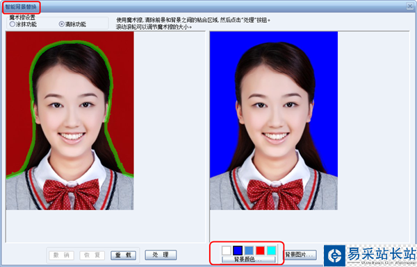 第二步:點擊就會跳出“智能背景替換”窗口,只要選擇該功能里滿意的背景色,輕輕一點擊“確定”,背景色瞬間就更換好了,根本不需要任何技術。用證照之星給證件照換背景簡直就是一鍵搞定。