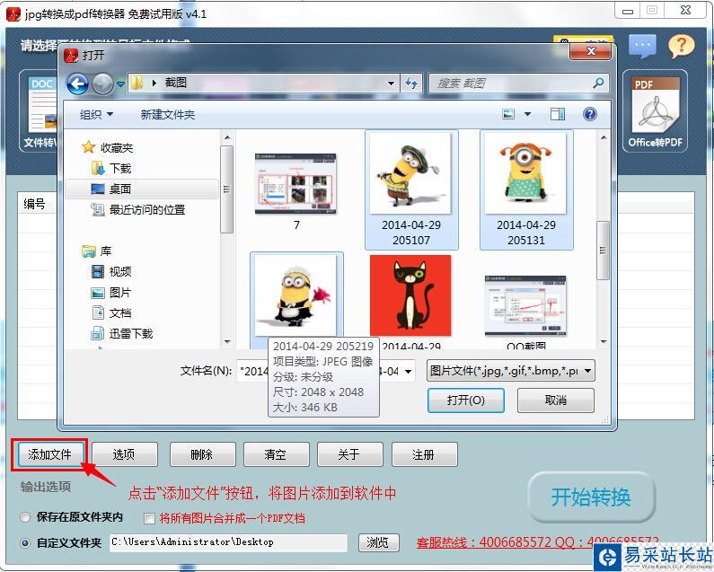 步驟2:點擊“添加文件”按鈕,在跳出的窗口中找到要轉換的jpg圖片,點選后點擊“打開”按鈕將多個圖片添加到軟件中,也可以直接將圖片拖拽到軟件中進行添加。
