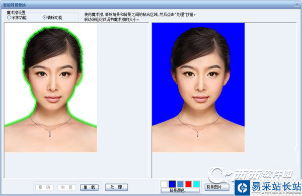 2、然后就是對證件照背景替換,只要點擊“背景處理”,軟件就會自動分離前景和背景,選擇一種顏色即可很簡單的就完成證件照背景的替換。