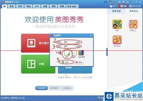2、點(diǎn)擊“新建”, 設(shè)置寬度:500像素,高度:200素,背景色:白色,點(diǎn)擊“應(yīng)用”。