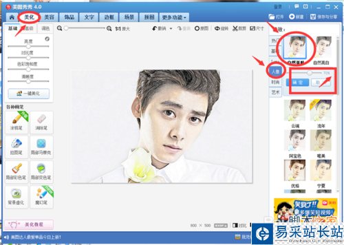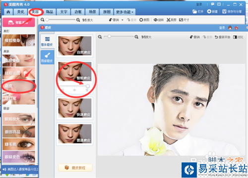 8、在工具欄中選擇“美容”選項下的“磨皮”--“整體磨皮”選項下的“智能磨皮”,“智能磨皮”可選擇深。