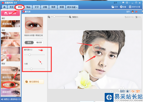 9、還是在“美容”選項下,選擇“睫毛膏”,對照片中的眼睛和眉毛進行來回的圖畫,這樣可以是眼睛和眉毛看起來更有線條。