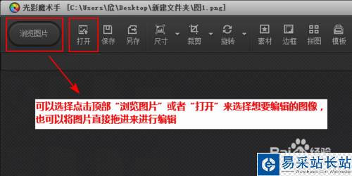 可以選擇點(diǎn)擊頂部“瀏覽圖片”或者“打開”來(lái)選擇想要編輯的圖像,也可以將圖片直接拖進(jìn)來(lái)