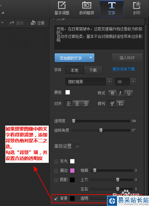 大家應(yīng)該也發(fā)現(xiàn)了,在上圖中添加文字之后,因?yàn)樵O(shè)置了文字顏色為白色,圖像的背景色又是淺色,就導(dǎo)致了文字看起來(lái)不太清晰。這個(gè)時(shí)候就需要為圖片添加一個(gè)黑色背景色,并設(shè)置55%左右的透明度,如圖所示: