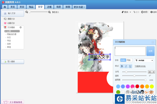 到了這一步的時候我們需要做的就是添加文字,如圖所示,選擇“文字”,“添加文字”,最后只要在我們的框子里輸入需要的字,換上適合的字體,將排版的位置調整好就可以啦。