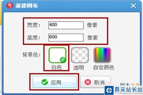 進入到這個小框之后小編選擇的是寬400,高600,大家可以根據自己的需要選擇,畫布白色,選擇應用。