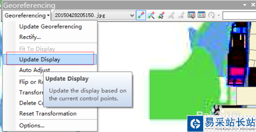 7、效果滿意之后,在工具條下拉框中選擇更新配準(Update Georeferencing),至此影像已配準好。