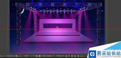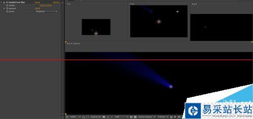 3、復制一層該mask蒙版,添加CC Radial Blur效果。通過調節center中心點位置可以讓射燈射向任意位置;amount數量控制射燈長短;zoom打成brightest明亮。效果如圖