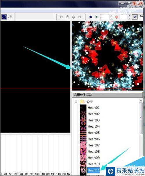 7、載入心形粒子庫,可能看到它非常炫的效果,可以查看一下哪一個(gè)才是你想要的效果。這里就選擇心形粒子庫中的heart11的粒子效果來進(jìn)行一下制作。