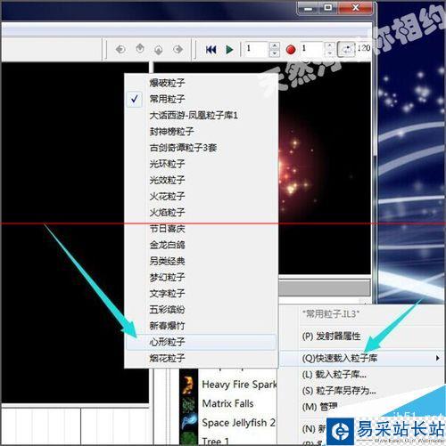 6、我們?cè)诹W訋斓挠疫吙瞻滋廃c(diǎn)擊右鍵選擇快速載入粒子庫,在它的下拉列表中選擇一個(gè)心形粒子。