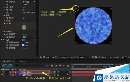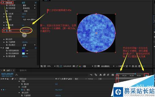 找到分形雜色下的演化,在固態層第一幀打上關鍵幀(第一幀為0x,數字不變,圖上是我調好了截圖寫的經驗步湊說明)然后在時間軸一半左右添加關鍵幀,并將演化的0x 調整為45x,這時你可以拖動時間軸觀察變化