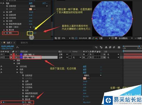 還是選擇下面的固態層,毛邊效果里面找到演化第一幀打上關鍵幀,0x不要調,這是我打好后截圖寫的說明。