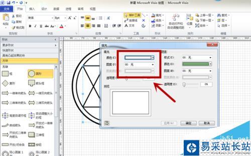 2、從左側圖形欄中選取“圓形”拖動至編輯區,并調整圓形線條粗細和填充顏色為適當值。