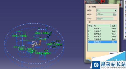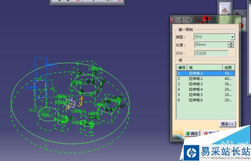 5、選擇多凸臺命令。對每個圖形經(jīng)行拉伸;從拉伸域1開始一次為50、40、30、20、10,然后拉伸域6為-20;點擊確定。得到多凸臺實體;