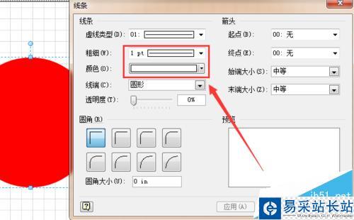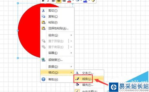 4、單擊鼠標右鍵,選擇“格式”-“線條”選項,將圓形的線條顏色設置為“純紅色”,如圖所示。