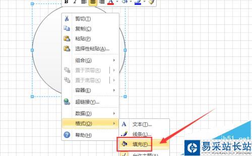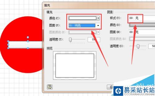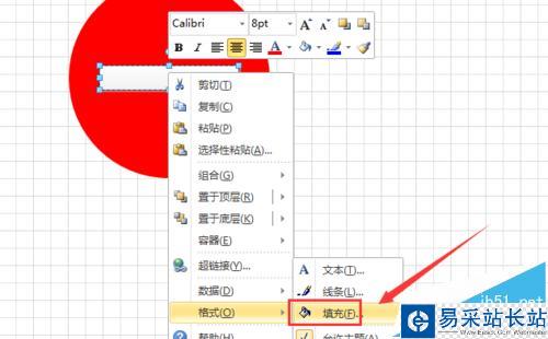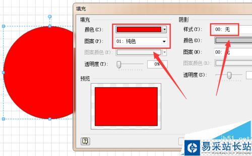 3、單擊鼠標右鍵,選擇“格式”-“填充”選項,將圓形的填充顏色設置為“純紅色”,陰影設置為“無”,如圖所示。