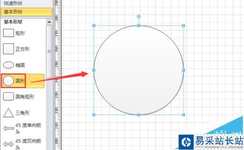 2、接著,從左側形狀欄中拖入一個“圓形”形狀到右側的編輯區域,如圖所示。