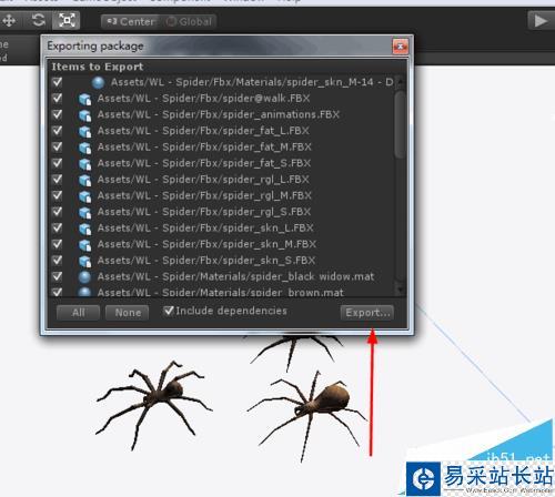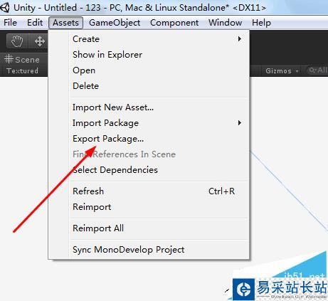 2、點擊菜單欄中的Asstes選項,選擇 export package。