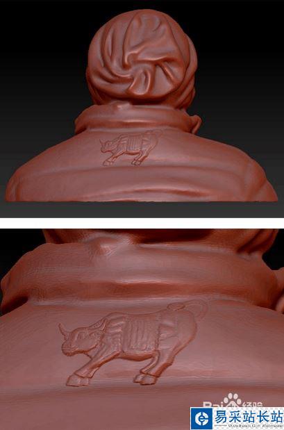 4、繪制浮雕:設(shè)置好筆刷的強度,將模型放置好,在人像模型的背后拖拽出浮雕模型。注意,雕刻的第一筆決定了浮雕的中心位置,筆刷的強度決定浮雕的深淺。如果對雕刻的效果不滿意,可撤銷重做。可以對模型做一些光滑處理,效果如圖所示。