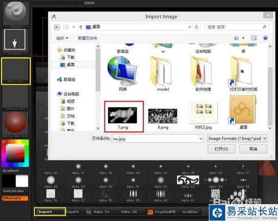 3、設(shè)置筆刷:在左側(cè)導(dǎo)航欄將筆刷類型設(shè)置為Standard(標準)類型,路徑方式設(shè)置為DragRect(拖拽),點擊Alpha Off>Import[筆刷通道關(guān)閉>導(dǎo)入],選擇準備好的浮雕灰度圖導(dǎo)入,如圖。