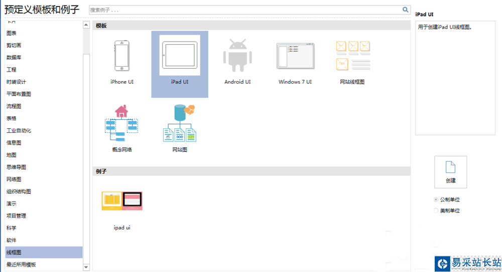 2、選擇模板“iPad UI”,點擊“創(chuàng)建”圖標(biāo),如下圖所示: