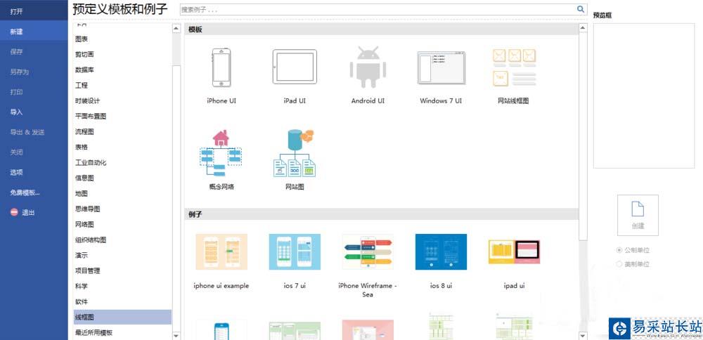 1、打開Edraw Max設(shè)計軟件,新建“預(yù)定義模板和例子”,選擇“線框圖”,如下圖所示: