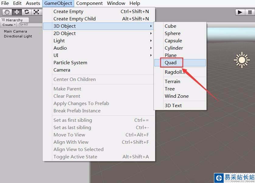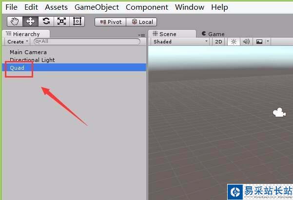5、點擊quad選項,在hierarchy窗口里就創建了該面片,如圖所示: